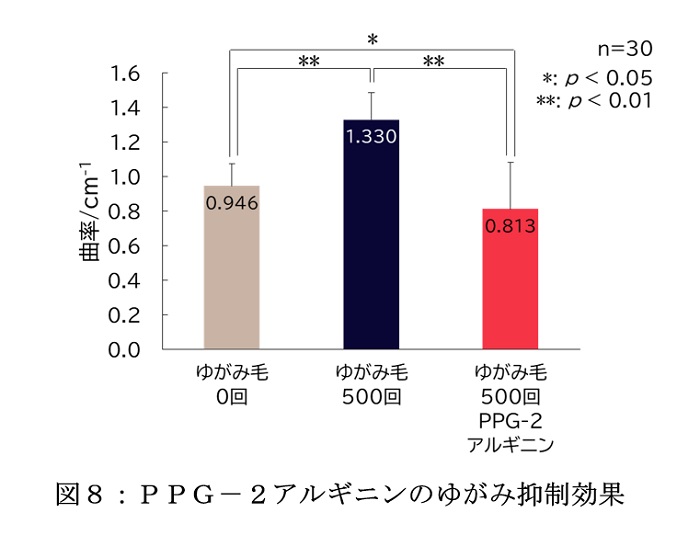 さらに、毛髪の「引張ダメージ」のケア効果を調べるために、反復延伸による曲率変化を計測しました。その結果、「PPG-2アルギニン」は、反復延伸による有意な曲率の上昇を抑え、かつ、反復延伸前よりも曲率を有意に低下させる効果があることが明らかとなりました(図8)。