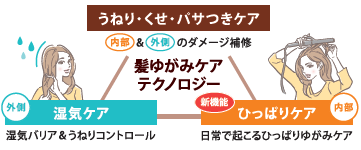 新機能「ひっぱりケア」を追加し、髪ゆがみの原因を髪の内部と外側からトータルケアします。