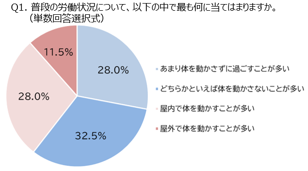 まず、普段の労働状況における運動量を分類して調査したところ、「あまり体を動かさずに過ごすことが多い」(28.0%)、「どちらかといえば体を動かさないことが多い」(32.5%)、「屋内で体を動かすことが多い」(28.0%)、「屋外で体を動かすことが多い」(11.5%)の割合となりました。