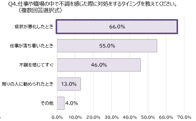 この結果は、”不調を感じた際に対処をするタイミング”でも同様の傾向にあり、最も回答の多い「症状が悪化したとき」にようやく不調への対処を始めていることが分かります。次いで「仕事が落ち着いたとき」が続いており、職場で不調を感じてもすぐには休めないなど、働く世代の多くが不調を抱えながら仕事をしている様子がうかがえます。