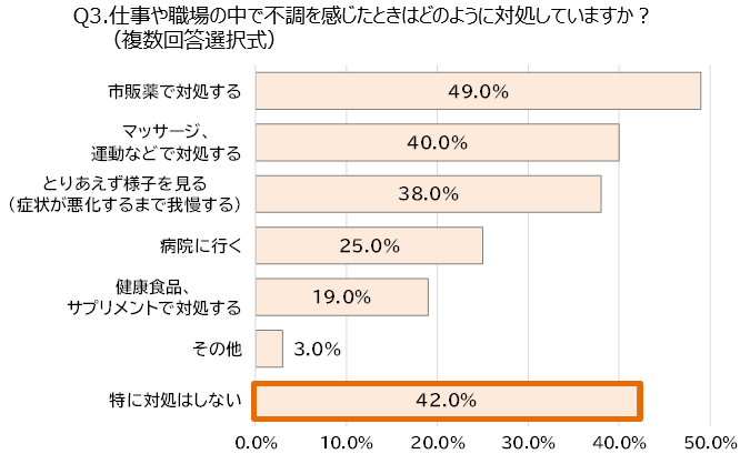 続いて、仕事や職場の中で不調を感じたときの対処法を尋ねたところ、「市販薬で対処する」に次いで、「特に対処はしない」との回答が多い結果となりました。前述の質問では、さまざまな不調を抱えていることが分かりましたが、その一方で症状を放置をしている方も多いことが分かります。