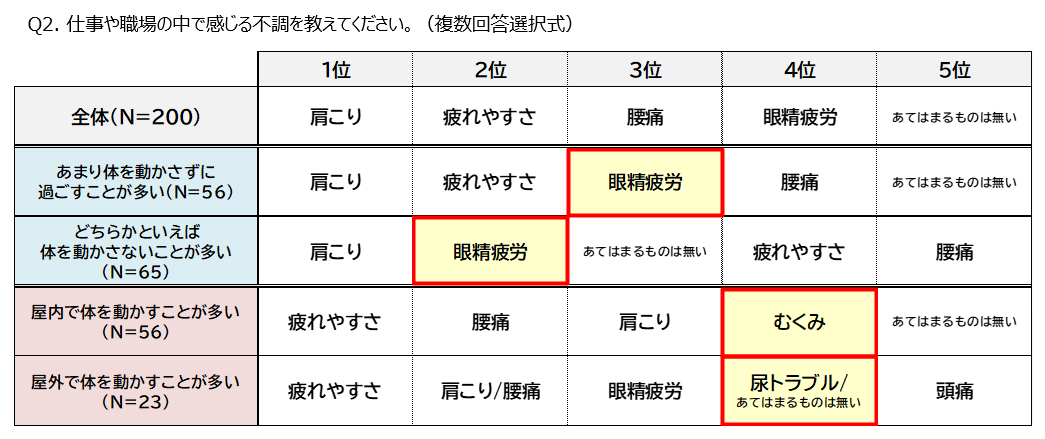 一方、体を動かすことが多いと回答した方は、「疲れやすさ」に次いで、「腰痛」が上位となり、体への負担を感じていることが分かります。また、屋内では「むくみ」、屋外では「尿トラブル」がランクインしており、立っている時間が長い方や、業務中の移動が多い方ならではの不調を感じている様子もうかがえます。