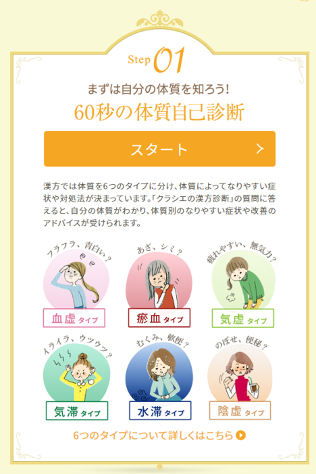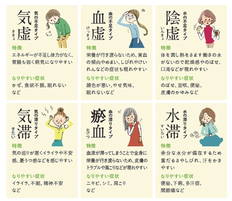 漢方では、人の体を構成する「気」「血」「水」のバランスが悪くなると体の不具合が現れると考えます。そのバランスに応じた6つの漢方体質タイプのどれにあたるかを診断できるコンテンツです。人によってその傾向は異なり、体質によって現れやすい症状も異なります。自分の体質を知り養生することで病気に備えることができます。