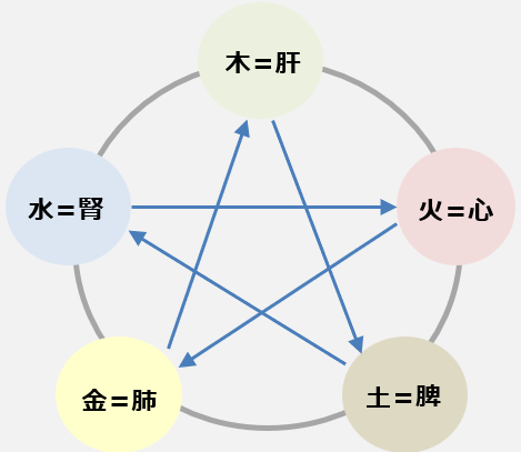 五行説とは、地球上のあらゆるものは、「木・火・土・金・水」の5つの要素から成り立っていると考える思想のことを指し、身体の働きを五行説に当てはめたものが五臓「肝・心・脾・肺・腎」です。5つの要素が、お互いに助け合ったり抑制したりすることによってバランスを保っています。