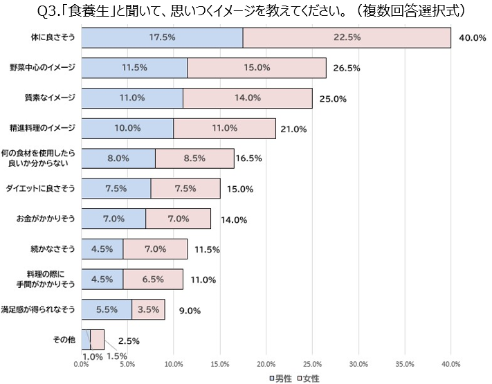 また、「お金がかかりそう」「続かなさそう」「料理の際に手間がかかりそう」を回答する方は1割程度であり、食養生に対してネガティブなイメージを持っている方は多くはない様子がうかがえます。