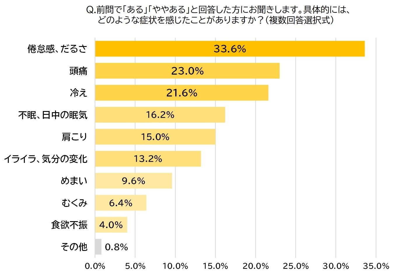 同調査で、具体的にどのような症状を感じたことがあるか尋ねたところ、「倦怠感、だるさ」が33.6%で最多の回答となりました。次いで、「頭痛」(23.0%)や「冷え」(21.6%)といった症状が続きました。