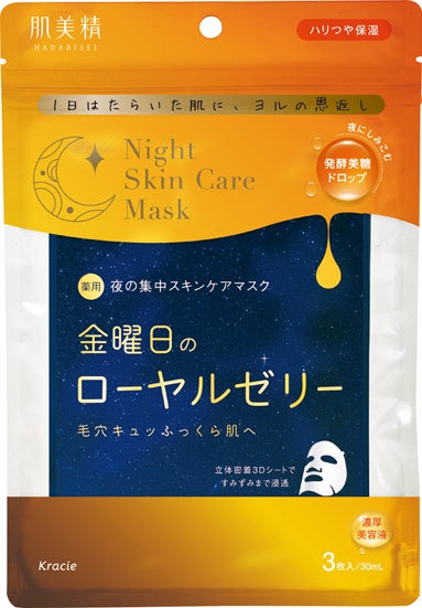 「肌美精ナイトスキンケアマスクシリーズ」は夜にしみこむ「発酵美糖ドロップ(うるおいバリア成分)」で夜の間にお肌を整え、朝起きるのが楽しみな潤沢バリア肌へと導きます。曜日の名前を持った3つのラインアップで「薬用金曜日のナイトスキンケアマスク」はローヤルゼリー(保湿成分)配合の濃厚美容液マスク。乾燥ダメージで疲れた肌も潤してハリつやを与え、毛穴キュッふっくら肌へ導きます。