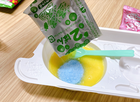 ・粉と水を混ぜると、色が変わってふわふわふくらむお菓子