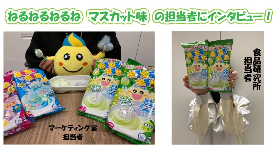 今回の「ねるねるねるね マスカット味」は、入社以来食品研究所で頑張ってきた社員が本社のマーケティング担当に配属されてから初めて手掛けた商品です。今まで一緒に食品研究所で切磋琢磨してきた仲間と協力しながら、新たな地で試行錯誤しながら生み出した渾身の1作となっております。