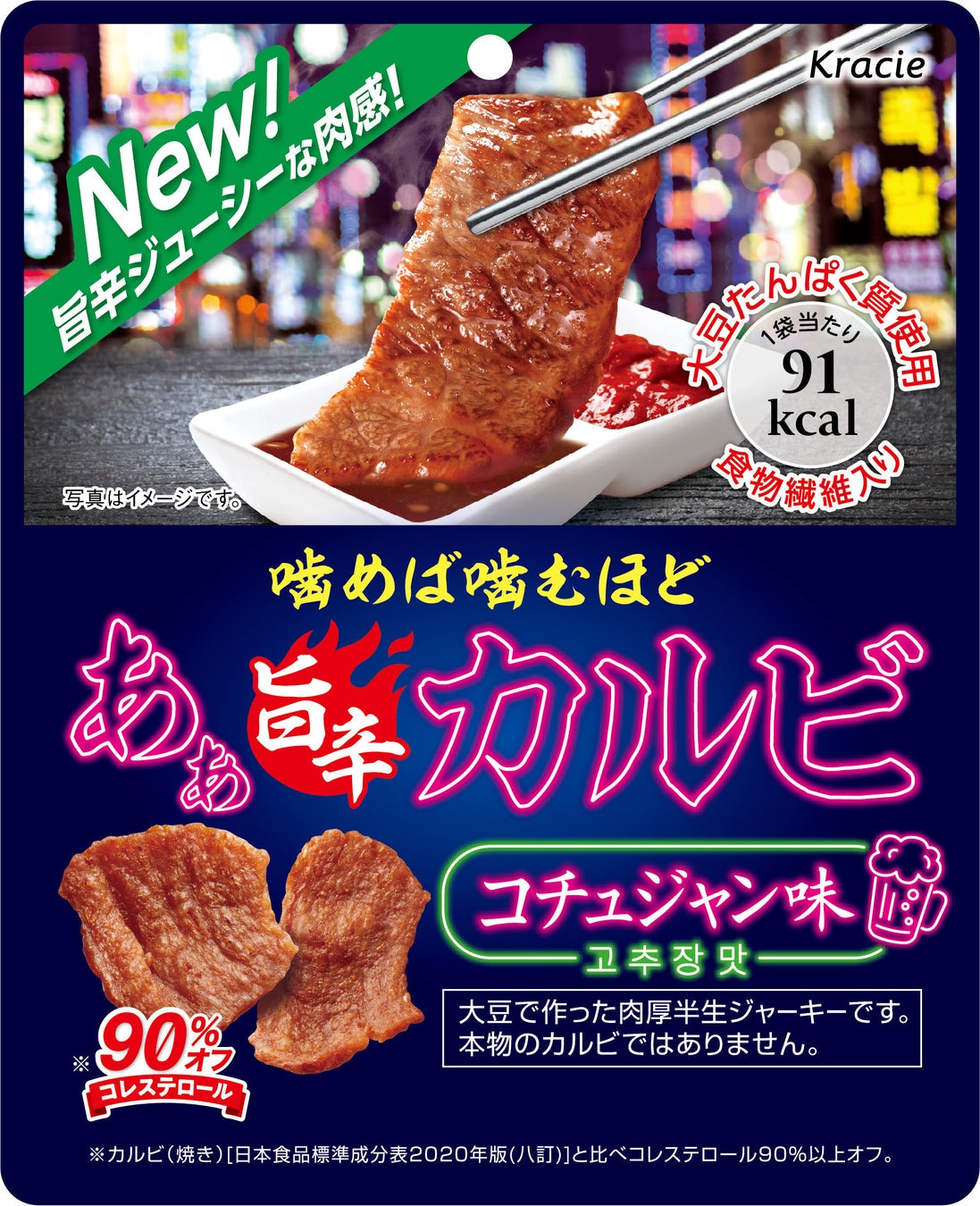 「あぁ旨辛カルビ」は、カルビのジューシーなおいしさを、大豆を主原料とした独自の製法で再現。コチュジャン(韓国風唐辛子味噌)味の後をひく旨味と辛味の濃厚な味わいがお酒のおつまみにぴったりです。大豆たんぱく質が主原料なので、牛肉を使用した場合と比べてコレステロールは90%オフ。動物性食品には含まれない食物繊維入りで、ヘルシーにお楽しみいただけます。また、デザインは焼肉の本場、韓国の夜を想起させるイメージで本品のおいしさを訴求します。
