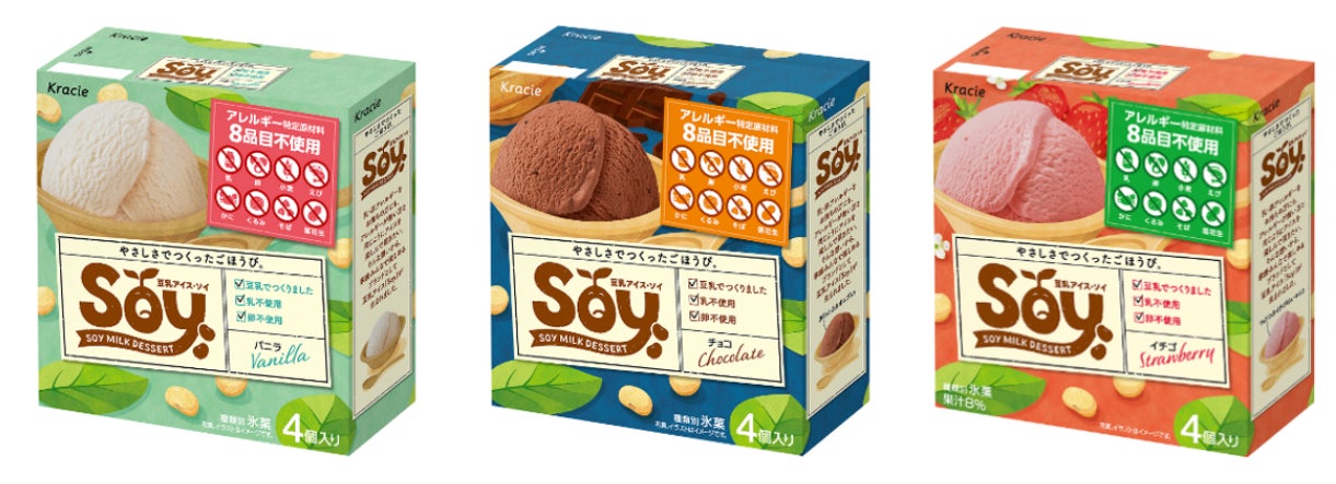 「Soy」は、乳・卵などのアレルギー特定原材料8品目不使用の、アレルギーの方でも安心して食べられる豆乳で作ったアイスです。この度、60mlのカップ4個入りのマルチパック「Soyマルチ(バニラ/チョコ/イチゴ)」の3種類を新発売。また、「Soyバニラ」をリニューアルしました。