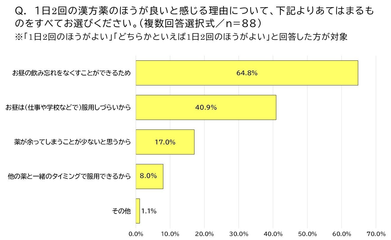 また、1日2回服用を選択した方を対象にその理由を尋ねると、最も多かった回答は「お昼の飲み忘れをなくすことができるため」(64.8%)となり、飲み忘れの悩みをお持ちの方が多いことが分かります。「お昼は(仕事や学校などで)服用しづらいから」(40.9%)と答えた方も多く、環境による薬の飲みづらさを実感している方も多い傾向も見られました。