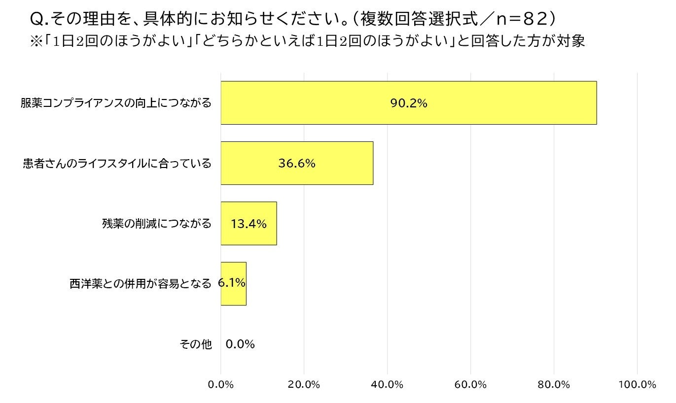 その理由については、「服薬コンプライアンスの向上」(90.2%)と回答した割合が約9割にも上りました。医師の方々は、患者様に処方薬を正しく服用していただきたいという想いが強いことが分かります。