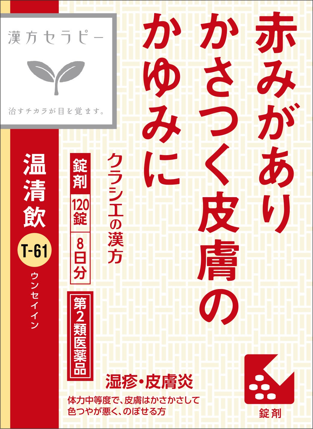「漢方セラピーシリーズ」ではそのニーズにお応えすべく、肌トラブルカテゴリに「温清飲エキス錠J」を追加しました。「温清飲(うんせいいん)」は、更年期世代のお悩み(更年期障害)に用いられる処方であり、更年期世代の方の肌トラブルにもお勧めです。赤みがあり、かさつく皮膚のかゆみで悩んでいる方は是非お試しください。