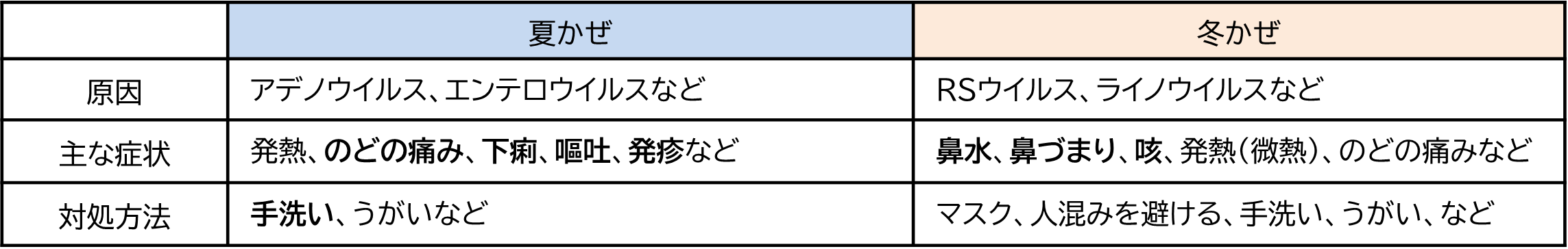 夏かぜは主にアデノウイルスやエンテロウイルスが原因となることが多く、経口感染や接触感染が多いため、腹痛や下痢、のどの痛みなどが特徴的な症状です。夏かぜの病原体は手を介して目や鼻、口を通して体内に侵入するので、「夏かぜ」は手洗いが最も大事な予防方法になります。一方、冬かぜは鼻水や咳などの症状がみられるため、飛沫感染が多いです。飛沫感染を全て防ぐことは難しいですが、マスクの着用や人混みを避けることで予防することができます。中でも、咳と発熱は子どもの症状として多くみられるため、注意が必要です。