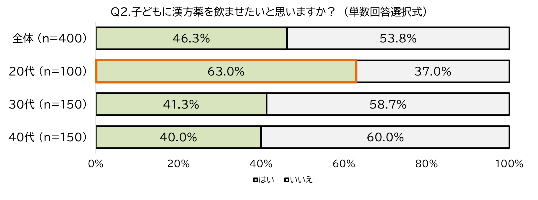 次いで、子どもに漢方薬を飲ませたいと思うかと尋ねたところ、46.3%の母親が「飲ませたい」と回答しました。この結果から、子どもの服用薬として漢方薬を選択したい母親は一定数存在することが分かります。また、前問と同様に20代の母親は漢方薬の服用に好意的な傾向がみられました。さらに、30代・40代では「子どもに漢方薬を服用させたことがある」と回答した人は3割程度に留まった一方で、「漢方薬を飲ませたい」と回答した人は4割に上ったことから、30代・40代の母親の中で、子どもに漢方薬を服用させた経験はないが、漢方薬を飲ませたい人がいることが考えられます。
