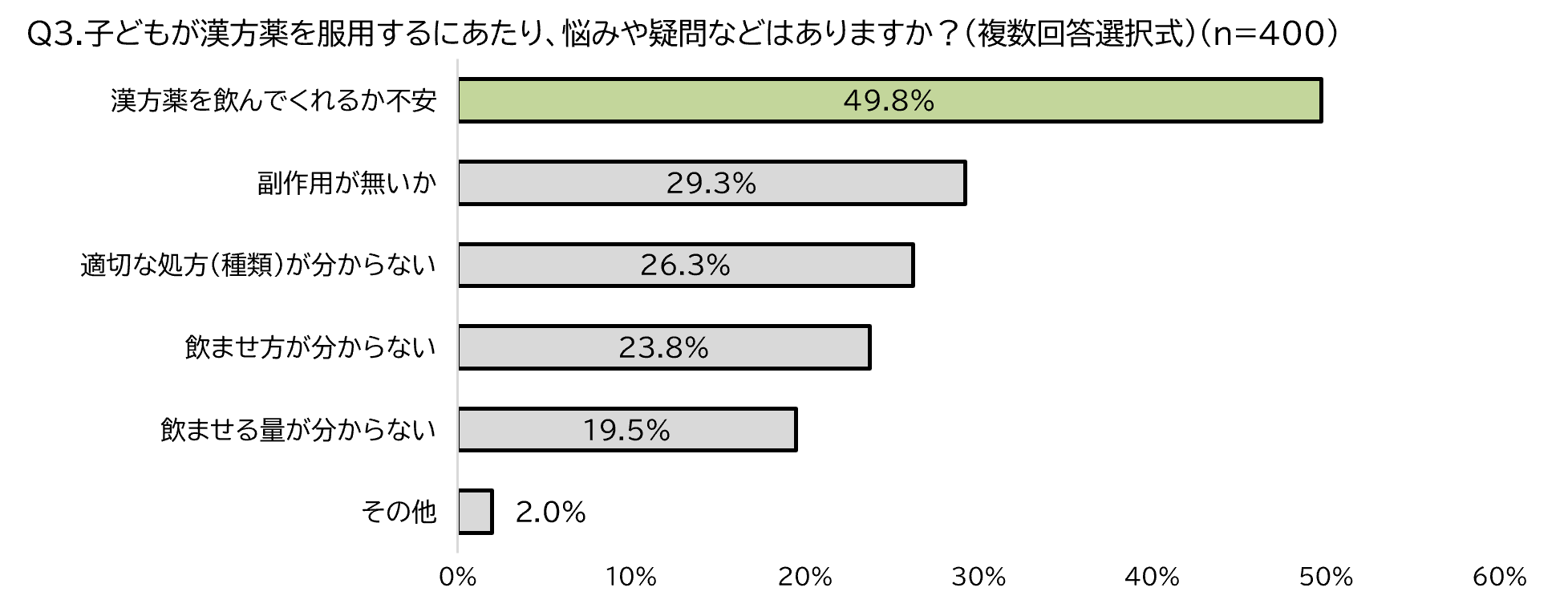 子どもが漢方薬を服用する際の悩みや疑問について尋ねたところ、約5割の母親が「漢方薬を飲んでくれるか不安」と回答しました。次いで、「副作用が無いか」「適切な処方(種類)が分からない」という回答が多くみられました。