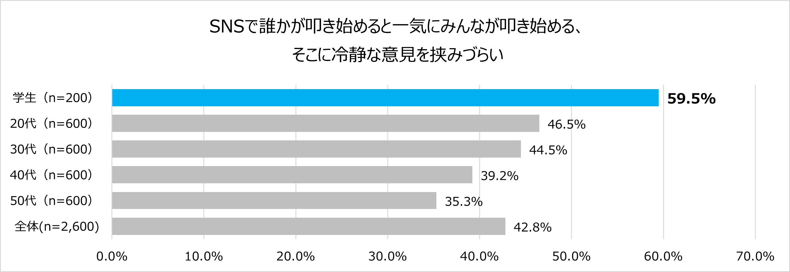 また、「SNSでみんなが叩き始めると、冷静な意見を挟みにくい」に関して年代別に見たところ、若い世代ほど「ブラックルーティン」と感じており、中でも学生の多くが「ブラックルーティン」と感じている。
