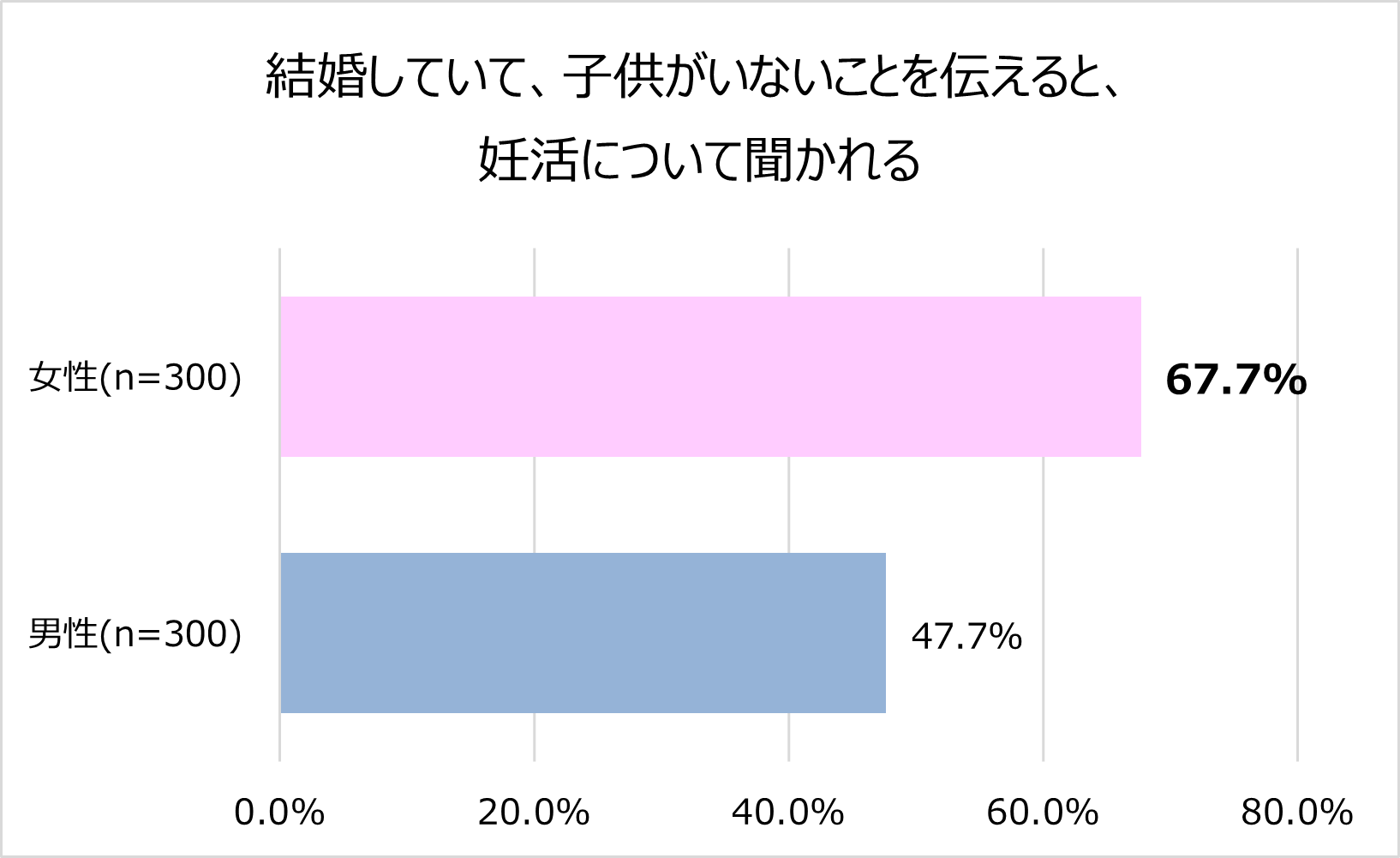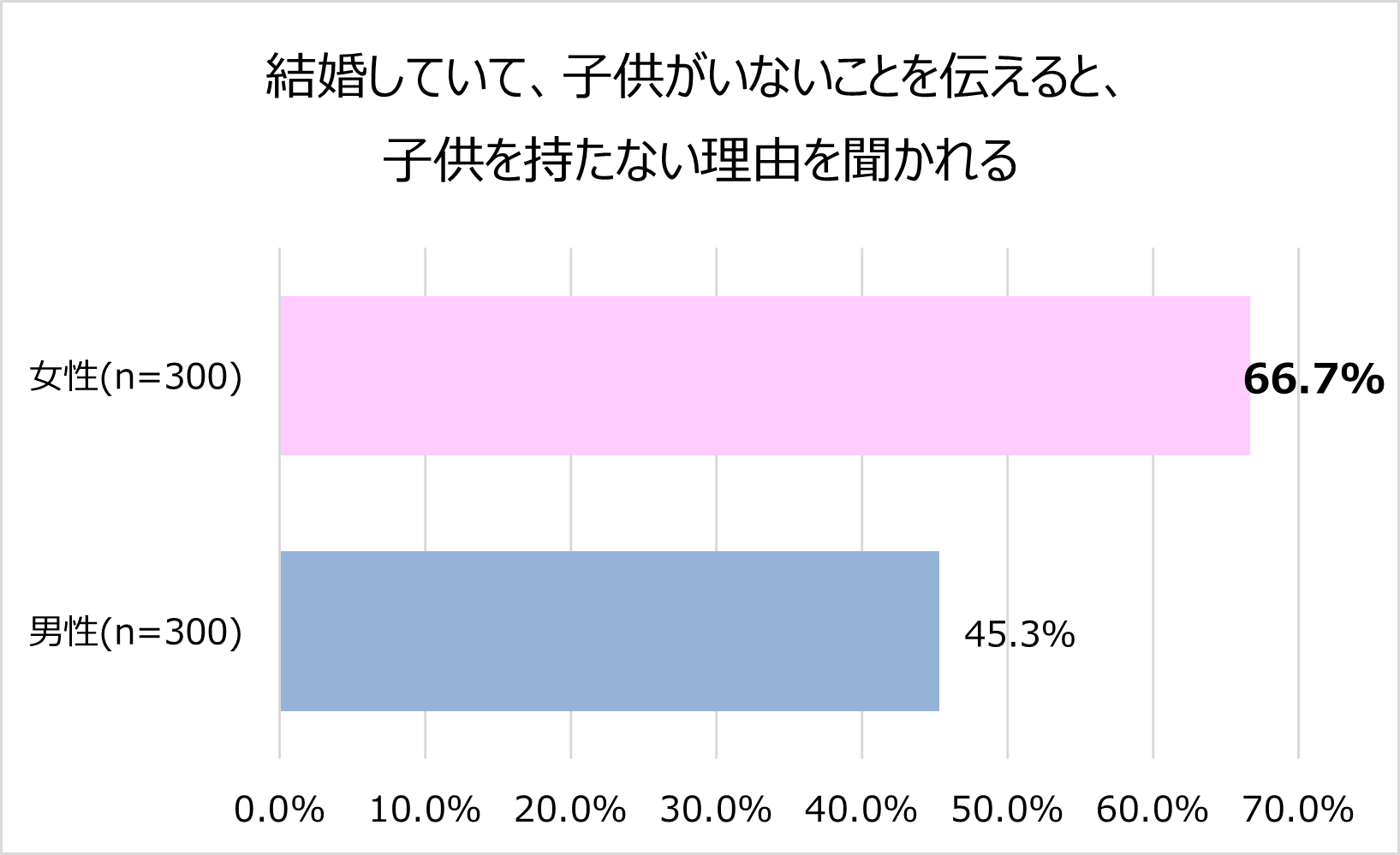 さらに、既婚かつ子どもがいない30~50代に、「結婚していて、子供がいないことを伝えると、妊活について聞かれる(全体57.7% /女性67.7%/男性47.7%)」、「結婚していて、子供がいないことを伝えると、子供を持たない理由を聞かれる(全体56.0% /女性66.7%/男性45.3%) 」について「ブラックルーティン」だと感じるか伺ったところ、いずれも半数以上の方がブラックルーティンだと感じると回答、中でも女性の回答はいずれも6割以上と高く、結婚したら出産するといった無意識的な旧来の価値観が「ブラックルーティン」につながってしまうことが推察できる。