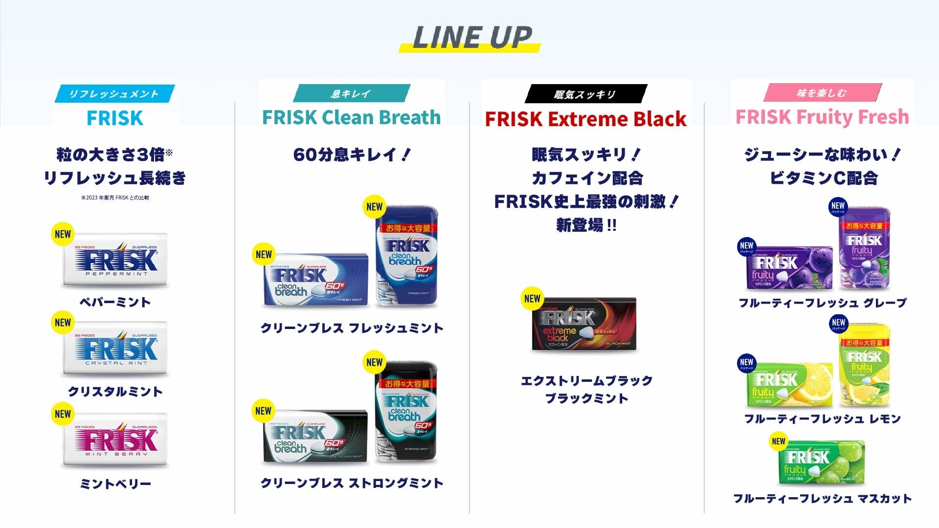 FRISKは1986年ベルギー薬局で、錠菓として販売開始。日本では1994年の全国発売以降、ミント錠菓のパイオニアとして、消費者ニーズに合致した革新的な商品の開発と導入を行ってまいりました。今回は、ミント錠菓に対する消費者の4大ニーズである「リフレッシュメント」「息キレイ」「眠気スッキリ」「味を楽しむ」に対応する為、20年ぶりに全商品同時フルリニューアルをいたしました*。