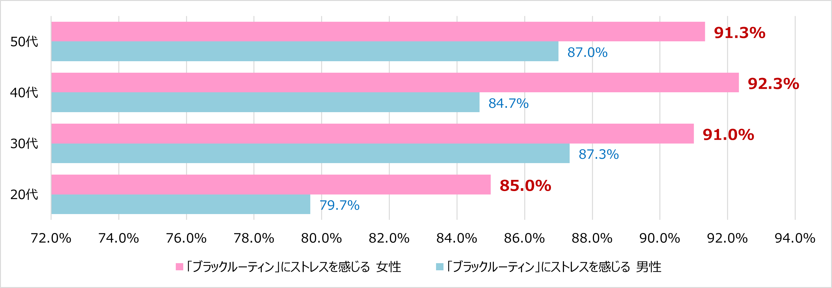 また、性別ごとに見てみたところ、全年代で女性の方が「ブラックルーティン」を感じていることが明らかとなった。