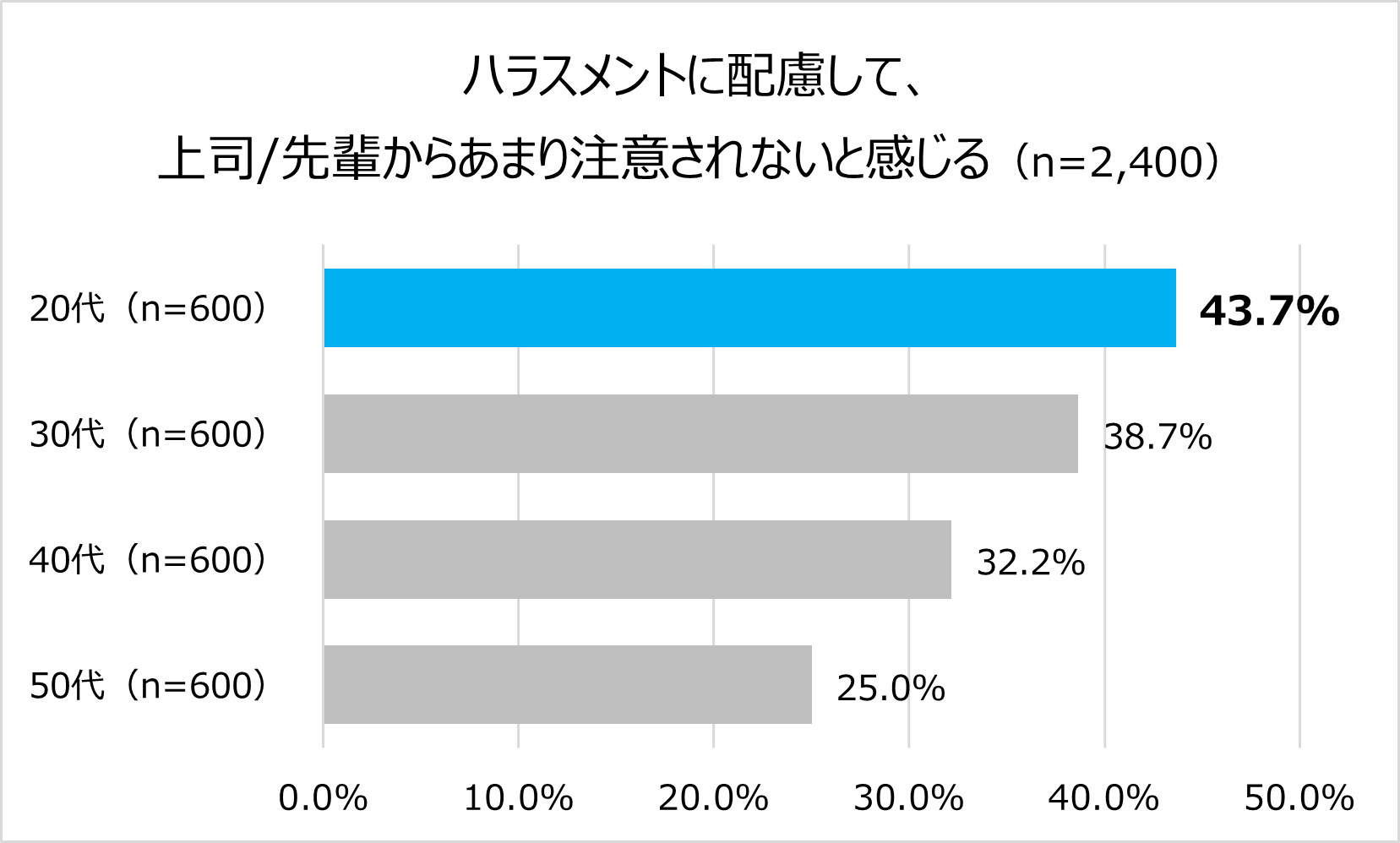 続いて年代別にオフィスでの同調圧力による「ブラックルーティン」を見てみたところ、「ハラスメントに気を遣われすぎていると感じる(20代47.0%/30代43.0%/40代38.0%/50代30.8%)」、「ハラスメントに配慮して、上司/先輩からあまり注意されないと感じる(20代43.7%/30代38.7%/40代32.2%/50代25.0%) 」に関して、20代の約半数が「ブラックルーティン」と感じていることが明らかとなりました。この結果から、上司から部下への過剰なハラスメントへの配慮が20代若手社員にとって、逆に「ブラックルーティン」として捉えられていることがうかがえる。
