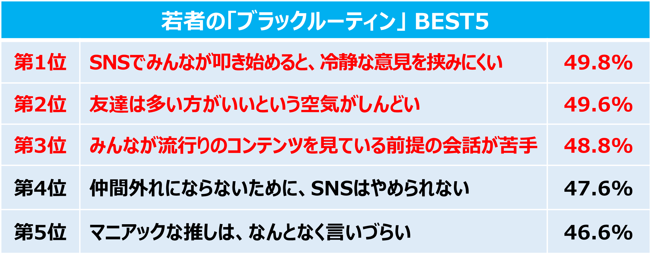 多様化が叫ばれ、若い世代を中心に様々な固定概念や同調圧力、悪しき慣習が払拭されつつある一方で、SNSという新たなツールを巧みに使いこなすZ世代だからこその “令和の「ブラックルーティン」”が発生してしまっていることが推察できる。