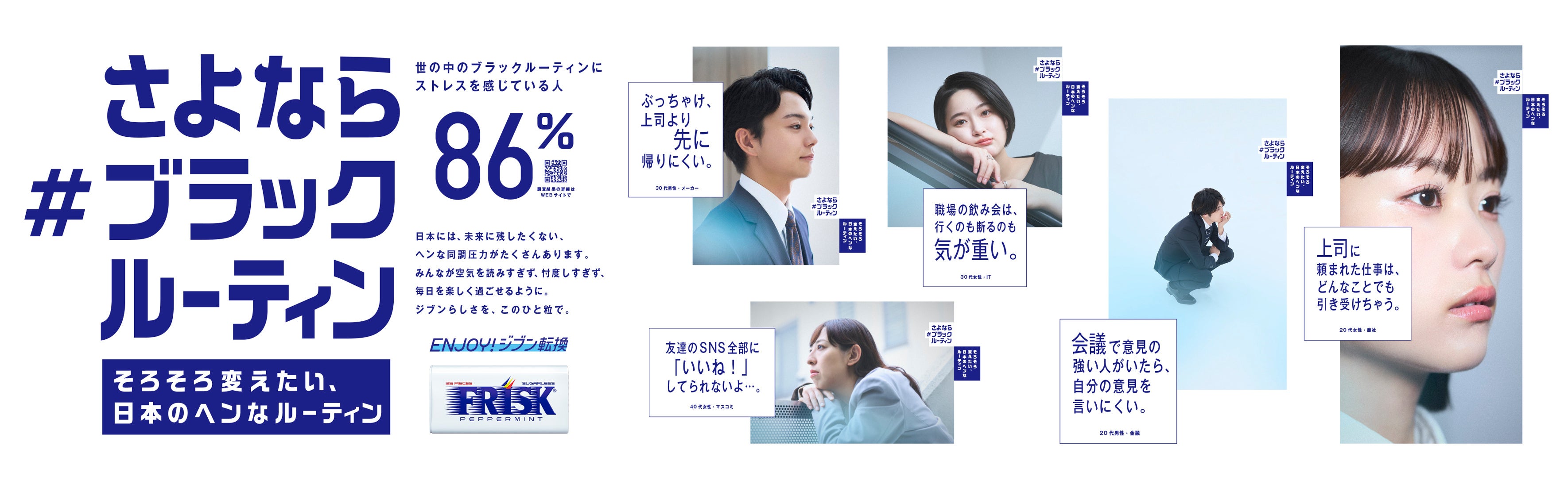 また今回の調査では、「ブラックルーティン」によるモヤモヤやストレスを解消するジブンなりの気分転換方法をお持ちで無い方が半数以上もいらっしゃることが明らかとなりました。今後FRISKは「Enjoy!ジブン転換」というメッセージととともに、毎日を「ジブンらしく楽しもう」という新しい価値を提案してまいります。