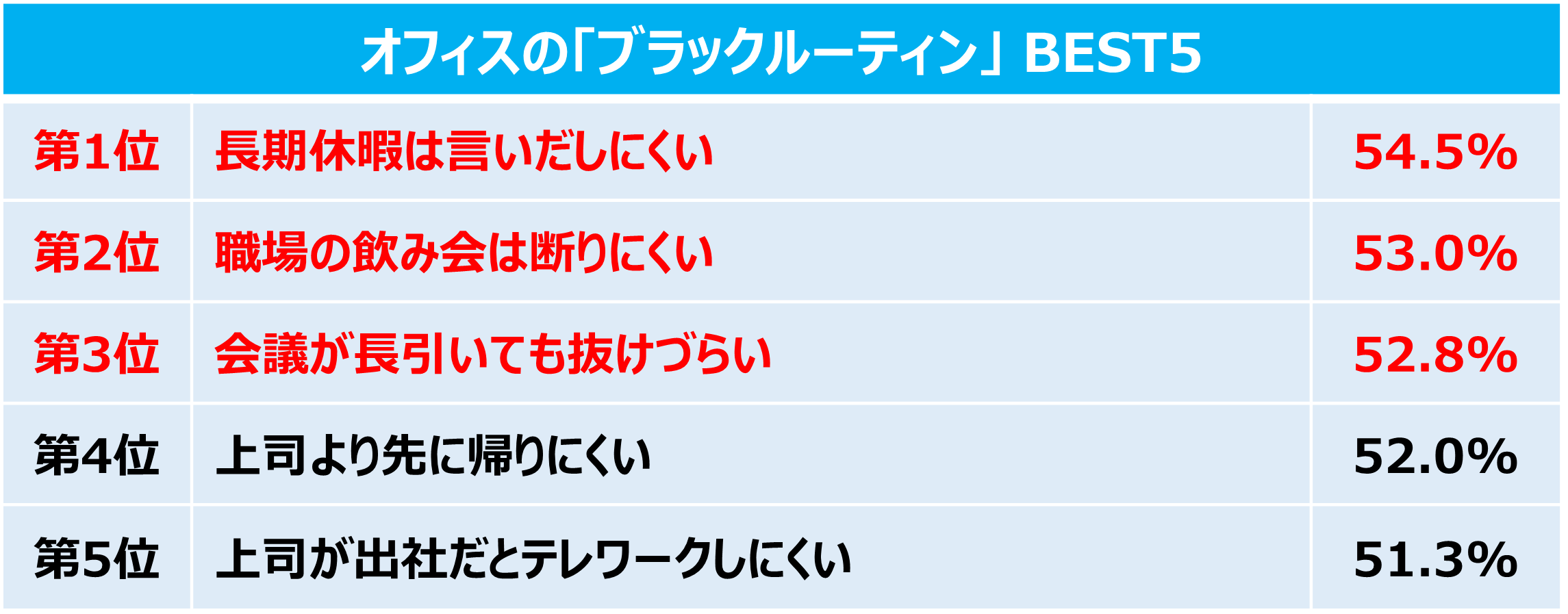 3.オフィスシーンの「ブラックルーティン」1位は“長めの休みを取りにくい” 会社員の2人に1人が回答。