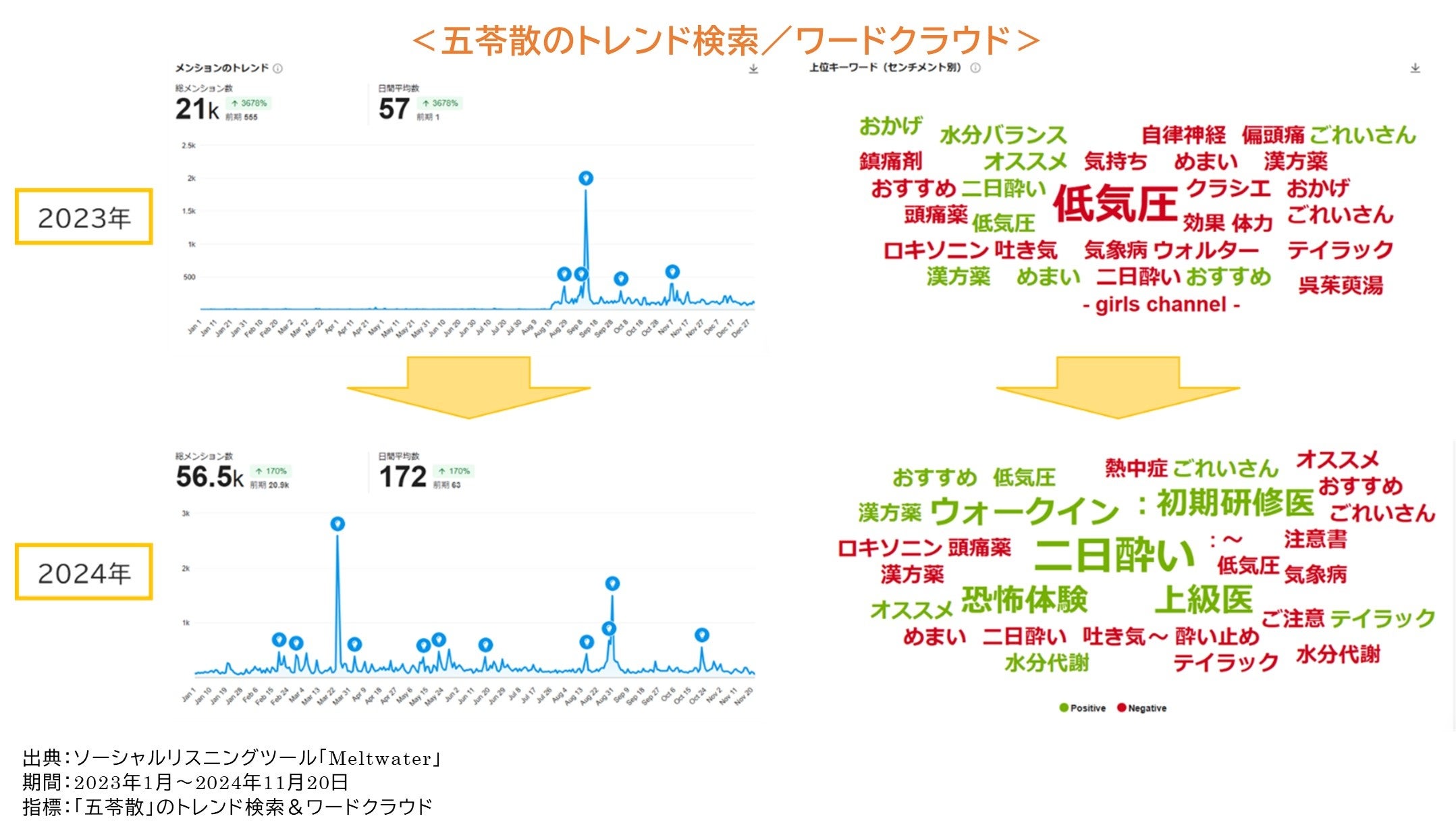 実際にSNS上では、2023年から2024年にかけて『五苓散』に関連する投稿数は、昨年対比で269%と大幅に増加しています。また『五苓散』と合わせて投稿されるキーワードを比較してみると、2023年は“気象病”対策のワードが多かったのに対し、今年は“二日酔い”対策へと変化している傾向もみられました。