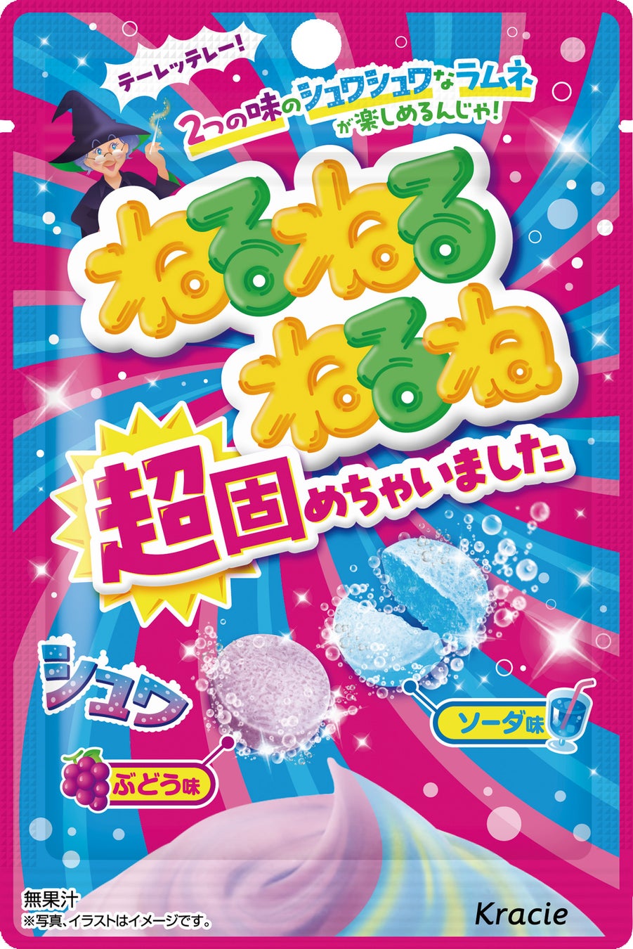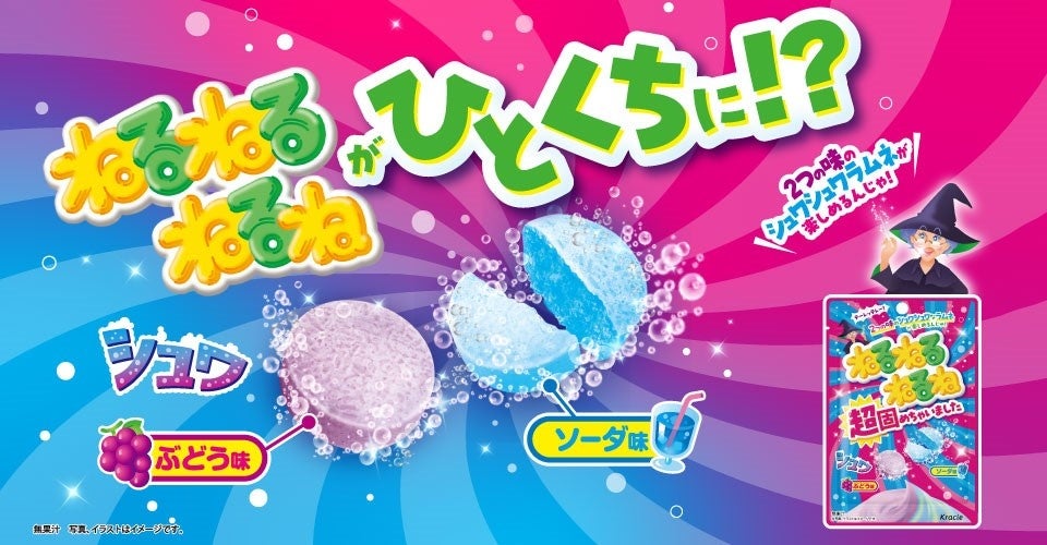「ねるねるねるね超固めちゃいました」は、あの「ねるねるねるね」の「懐かしい味」と「食感」をシュワシュワな発泡ラムネで再現し、まるでねるねるねるねを超固めたような一口で手軽に楽しめます。口に入れた瞬間シュワシュワして楽しさや驚きを提供し、懐かしい味わいで子どもの頃を思い出させる商品です。味は「ねるねるねるね」を再現したぶどう味とソーダ味の2種類で、ソーダ味は超シュワシュワ食感です。チャック付きの袋なので持ち運びも便利で、いつでも・どこでも・誰でも・外出時に水がなくても「ねるねるねるね」の味わいを楽しむことができます。
