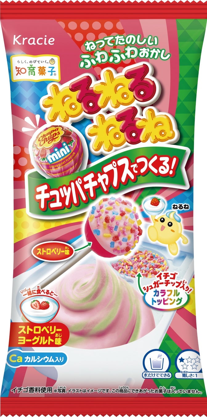 ・ねるねるねるねはストロベリーヨーグルト味、チュッパチャプスはストロベリー味、併せて食べるとより楽しめるイチゴ感