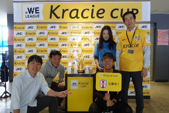 また今回の試合では、「マー&ミー ボディソープ」と「willone 2WAYクリアマスクウォッシュ」のサンプルおよび、開幕を記念して制作した、WEリーグ副理事長の宮本恒靖さんとWEリーグ理事の海堀さん、クラシエ社長の草柳による鼎談記事の抜き刷りを配付しました。