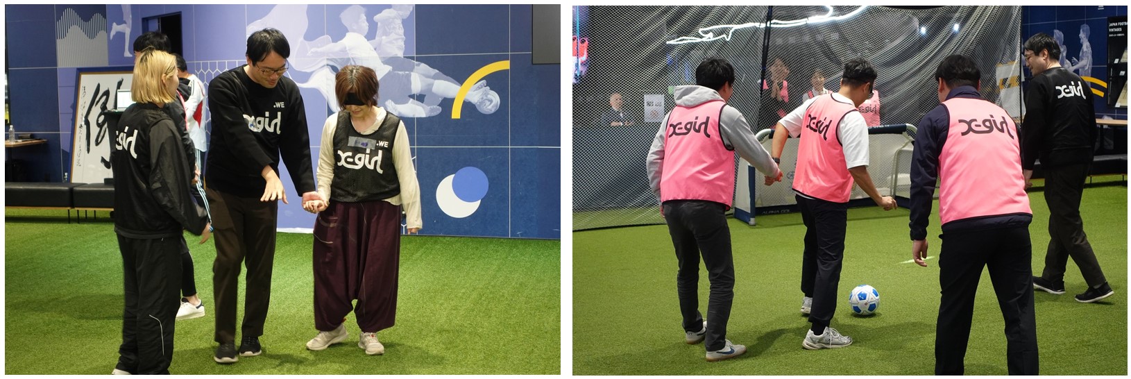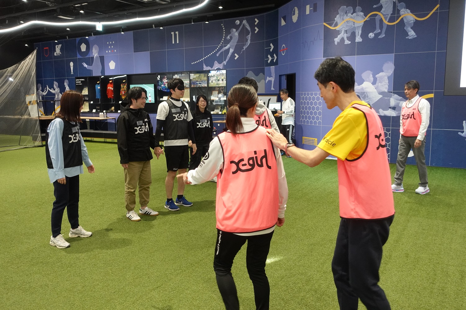 次のセッションでは、日本障がい者サッカー連盟 専務理事の松田薫二さんをゲストにお迎えし、年齢や性別、経験の差に関わらず誰もが楽しめるウォーキングフットボールを実施。DE&Iの観点から、視覚に障がいのある参加者がいる場合は対戦相手もアイマスクを着用したり、音が鳴るボールを使用したりと、“誰もが公平に、安心安全にプレーを楽しめる”ルールや仕組みを全員で考え、実践しました。
