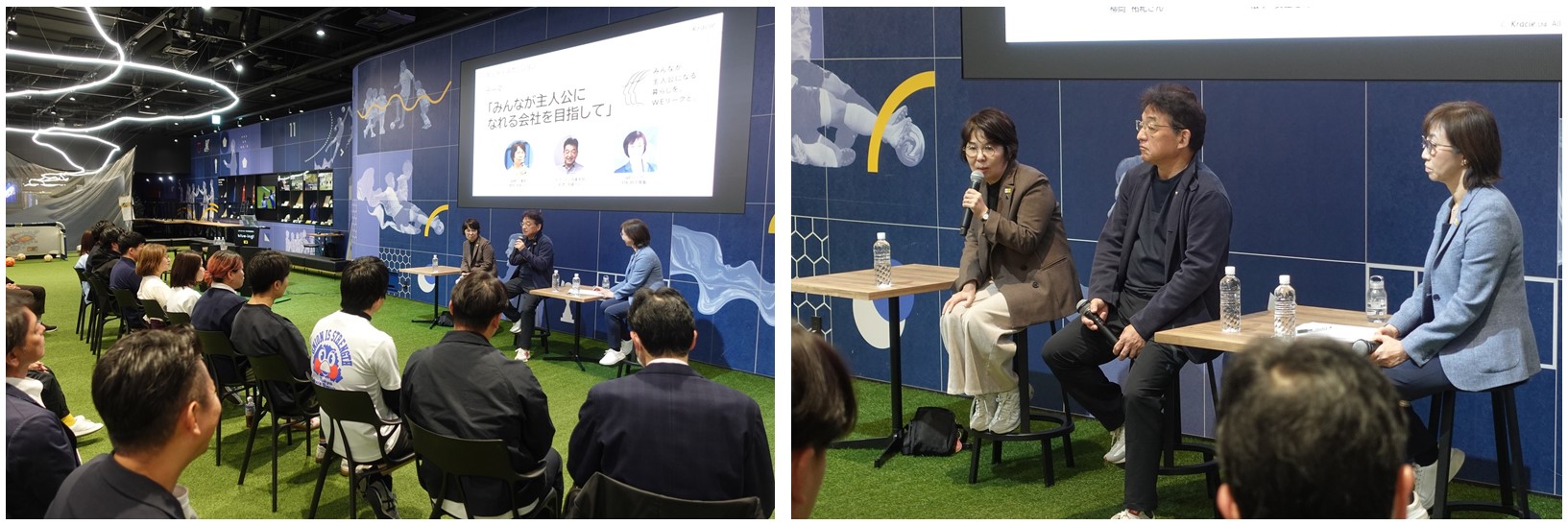 次に、総務・人事室とものづくり改革本部から2名が登壇し、WEリーグ理事の松村邦子さんのファシリテーションのもとパネルディスカッションを実施。「みんなが主人公になれる会社を目指して」のテーマで、多様な社員とコミュニケーションを図る上で、互いの違いを尊重する大切さについて意見交換を行いました。