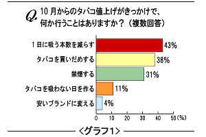 また、「タバコを買いだめする」(38%)、「禁煙する」(31%)と続き、「タバコを吸わない日を作る」と答えた「休煙」派も11%いました。<グラフ1>