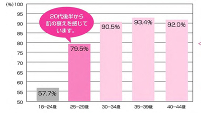 いくつになってもキレイでいたいと願う女性にとって、肌の衰えは深刻な悩みです。当社の調べでは、ハリのなさ、毛穴の開き、くすみなど、肌の衰えを感じ始めるのは、20代後半で約80%に上るという結果が出ております。そして、早期のエイジングケア意識の高まりにより、市場も拡大傾向にあります。