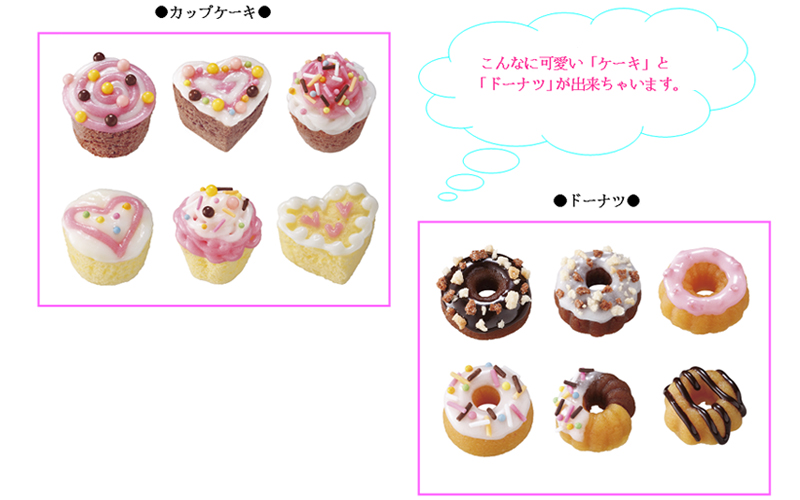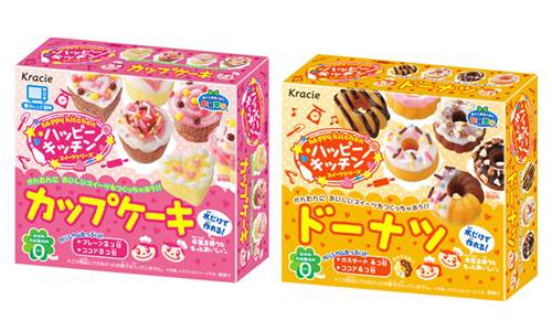 「ハッピーキッチン」は、カップケーキとドーナツの2種類で展開いたします(各262円)。用意するのは水だけでOK!トレー付きなので、ボウルや泡立て器などの準備もいりません。水の代わりに牛乳を使用すれば、さらにおいしく出来上がります。お子さんだけでも手軽につくれ、小学生の女子に人気の職業「パティシエ」になった気分が味わえる楽しいお菓子です。親子で、また、お友達と一緒に手作りスイーツをお楽しみください。
