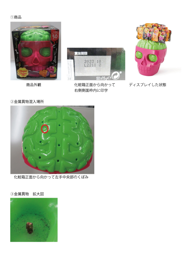 この度、弊社が輸入し販売しております「チュッパチャプス スカル3Dアソートディスプレイ」のディスプレイ用容器のフタの一部に金属異物が混入し、露出している部分でお客様のお子様が手をけがされる事案が発生いたしましたので、対象となる商品を自主回収させていただきます。