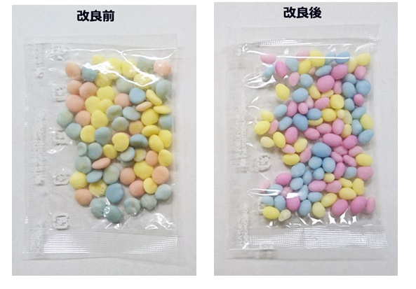 「おたのしみねるねる」で、『カラフルパフの色が少しまばら』、『カラフルパフの色がうすく、パフ生地の色が見えている』等のお声をいただきましたので、新商品「パフェパフェねるねる」で、色と形を変更しました。
