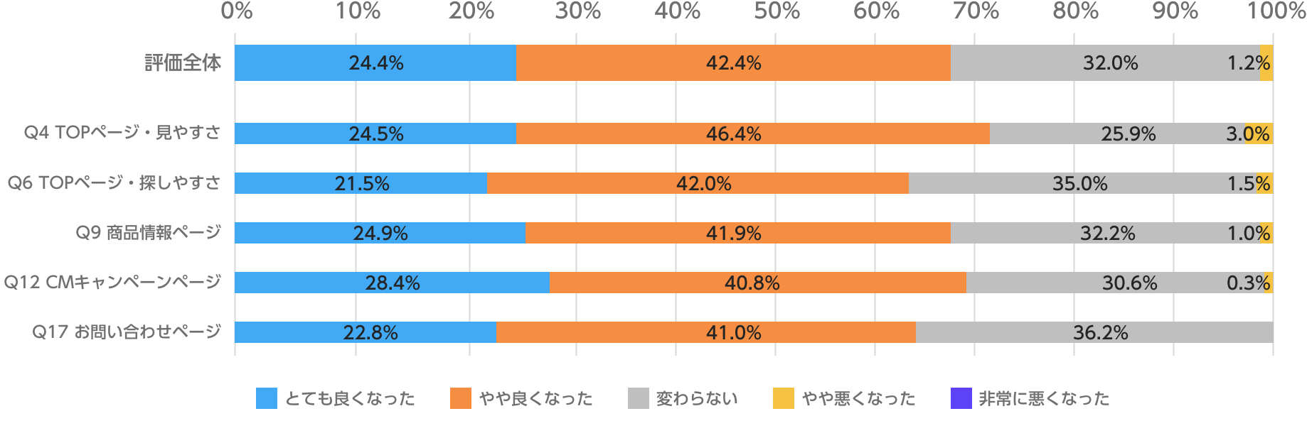 次にTOPページをはじめとする各ページがリニューアル前と比べて見やすくなったか/使いやすくなったかという質問では、ほとんどのページで65~70%近い方が「良くなった」という評価になりました。特に、「TOPページの見やすさ(71.1%)」と「CM・キャンペーンページ(69.2%)」の評価が高くなりました。
