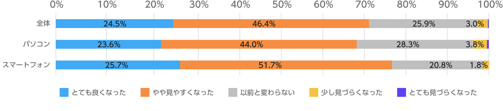 ご覧になっている端末別に評価結果を比較しても「スマートフォンのほうが評価がやや高い」という傾向もみられています。