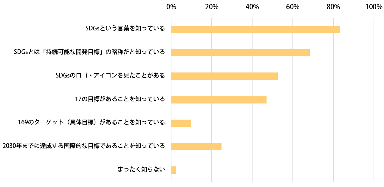 最初に「SDGs」の認知度について聞いたところ、83%の人が「SDGsという言葉を知っている」と回答し、「持続可能な開発目標の略称だと知っている」と答えた人は68%でした。また5割近い方が「17のゴール(目標)がある」まで知っていて、4人に1人は「2030年までに達成する国際的な目標である」ことを知っていると回答されました。さまざまなメディアで取り上げられる機会が増えたので、認知度も上がっているようです。