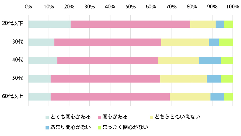 続いて「SDGsの関心度」については、「とても関心がある」「関心がある」を合わせると66%の人がSDGsに関心を持っているという結果でした。年代別に見ると、どの世代も6割以上が関心を持っていると回答し、中でも20代以下の若い世代の関心度が高く、「とても関心がある」と答えた割合が20%に達し、全年代の中で最も高い割合で、20代以下の8割近くがSDGsに関心を持っているという結果になりました。SDGsを学校教育で扱うことが求められるようになり、授業でSDGsを学ぶ機会が多くなっている影響で、若い世代の社会貢献意識が高い傾向にあるようです。
