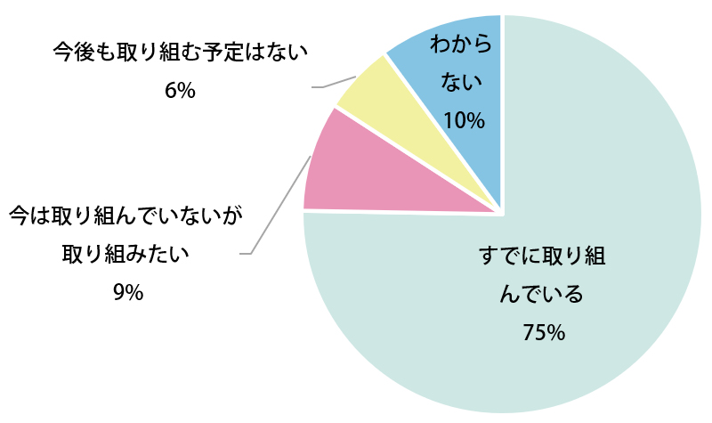 次に、SDGsの取り組みについて聞いてみたところ、なんと75%の人が「すでに取り組んでいる」と回答。さらに「取り組みたい」も合わせると、たんぽぽメンバーさんの84%がSDGsに取り組む考えがあることがわかりました。