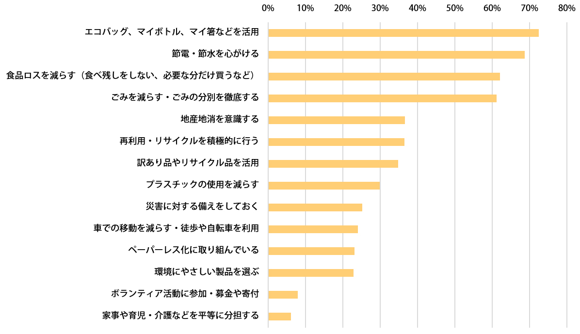 すでにSDGsに取り組んでいると回答した人に、具体的にどんなことをしているのかを聞いてみました。回答数が多かったのは「エコバッグ・マイボトル・マイ箸の活用」が72%、続いて「節電・節水」が69%、「ごみを減らす・ごみの分別」「食べ残しをしない」が約60%という結果で、日常生活で身近に取り組めることから実践していることがわかりました。