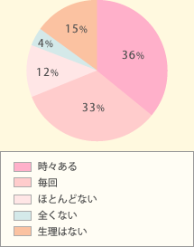 生理痛がおきる頻度は「時々ある」が36%、「毎回」が33%と、痛みを感じたことがある方が約70%。