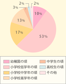 家族でお風呂に入っていたのが「小学校低学年の頃まで」という方が53%で、次いで「小学校中学年頃(17%)」、「小学校高学年頃(13%)」という結果でした。小学校を卒業する頃には、約90%の方が1人でお風呂に入るようになっている一方で、高校生頃まで一緒に入っていたという方は2%。 やはり各家庭によって、一人お風呂デビューの時期はさまざまなようですね!