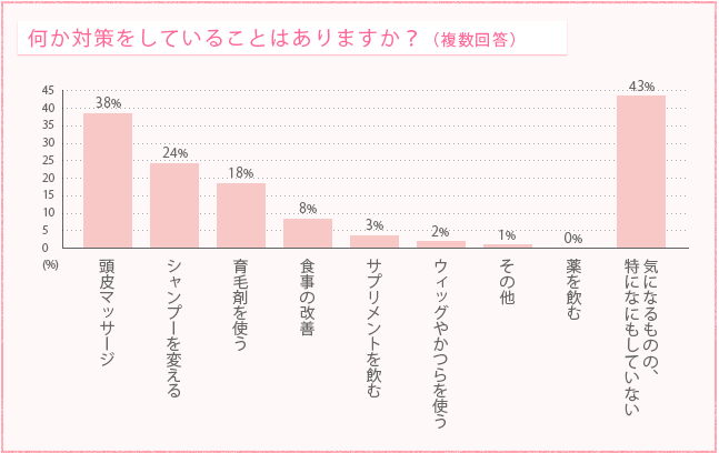 そして気になったのが、対策をとることよりも多かった「気になるものの、特になにもしていない(43%)」という声。抜け毛や薄毛に対する商品やサービスが増えているものの、どれが1番自分に効果的なのかわからなかったり、試したものの継続できなかったり、費用がネックになったりと、満足な対策ができているという人は少ないのかもしれません。