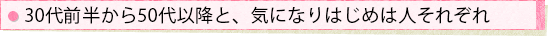 気になりはじめるタイミングは、「30代前半(15%)」「30代後半(18%)」「40代前半(18%)」「40代後半(16%)」「50代以上(18%)」と人によってそれぞれでした。